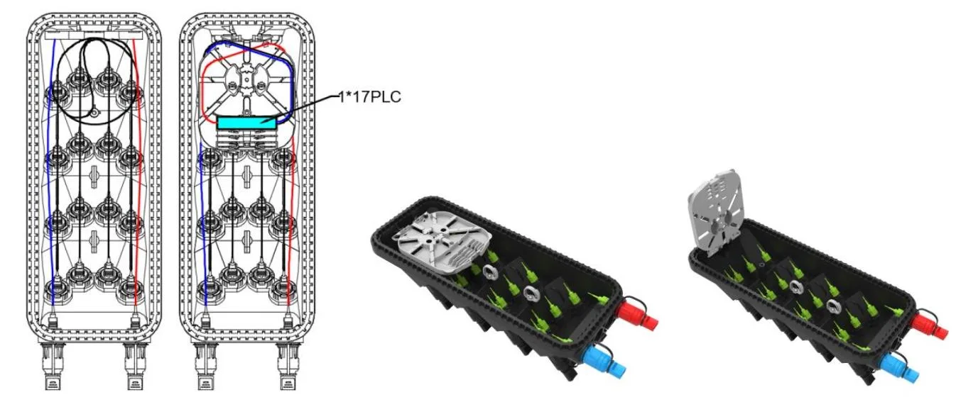 5. Ang interior ay nilagyan ng 1x2 FBT splitter+ 1x16 PLC splitter o 1x17 PLC splitter.